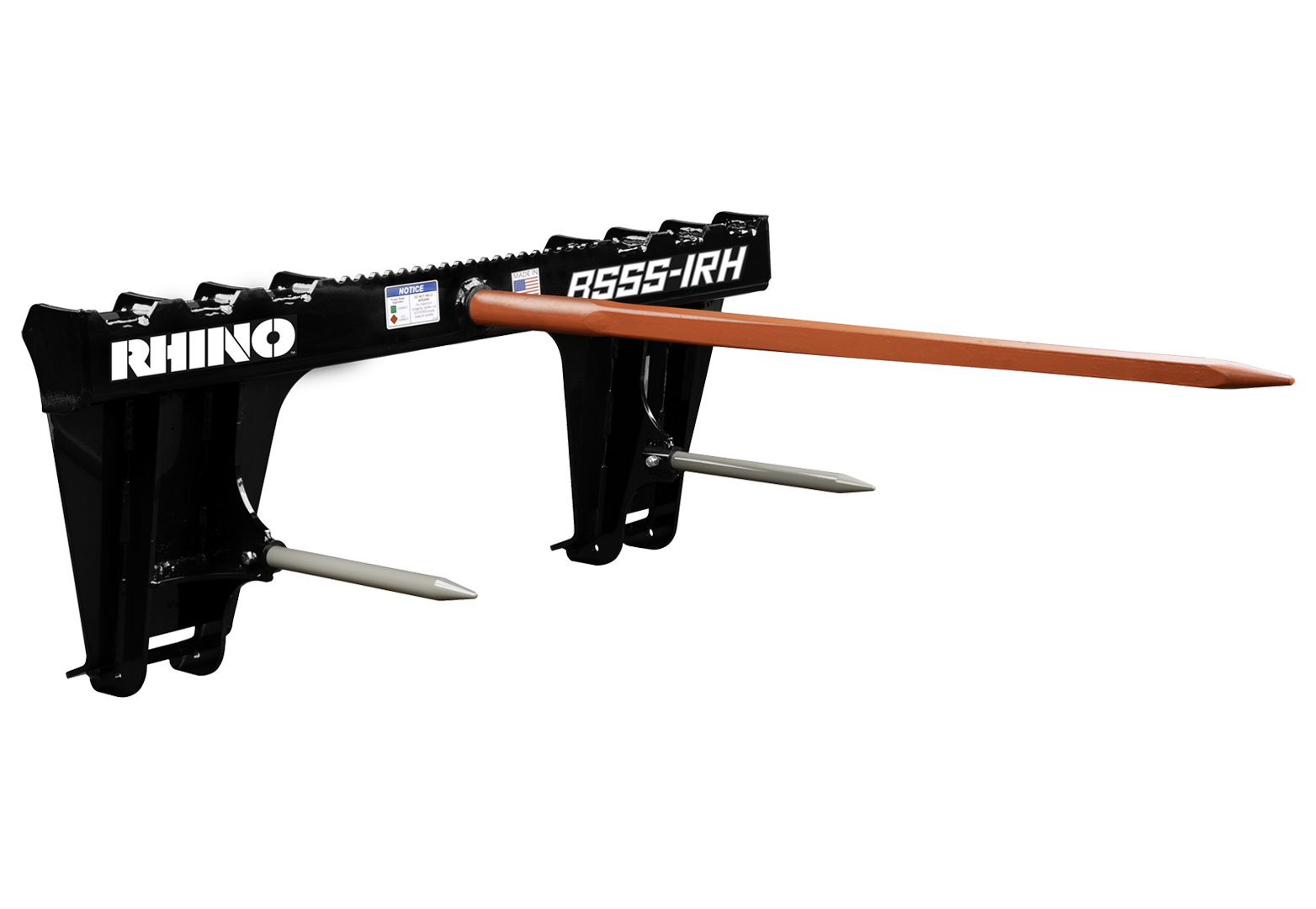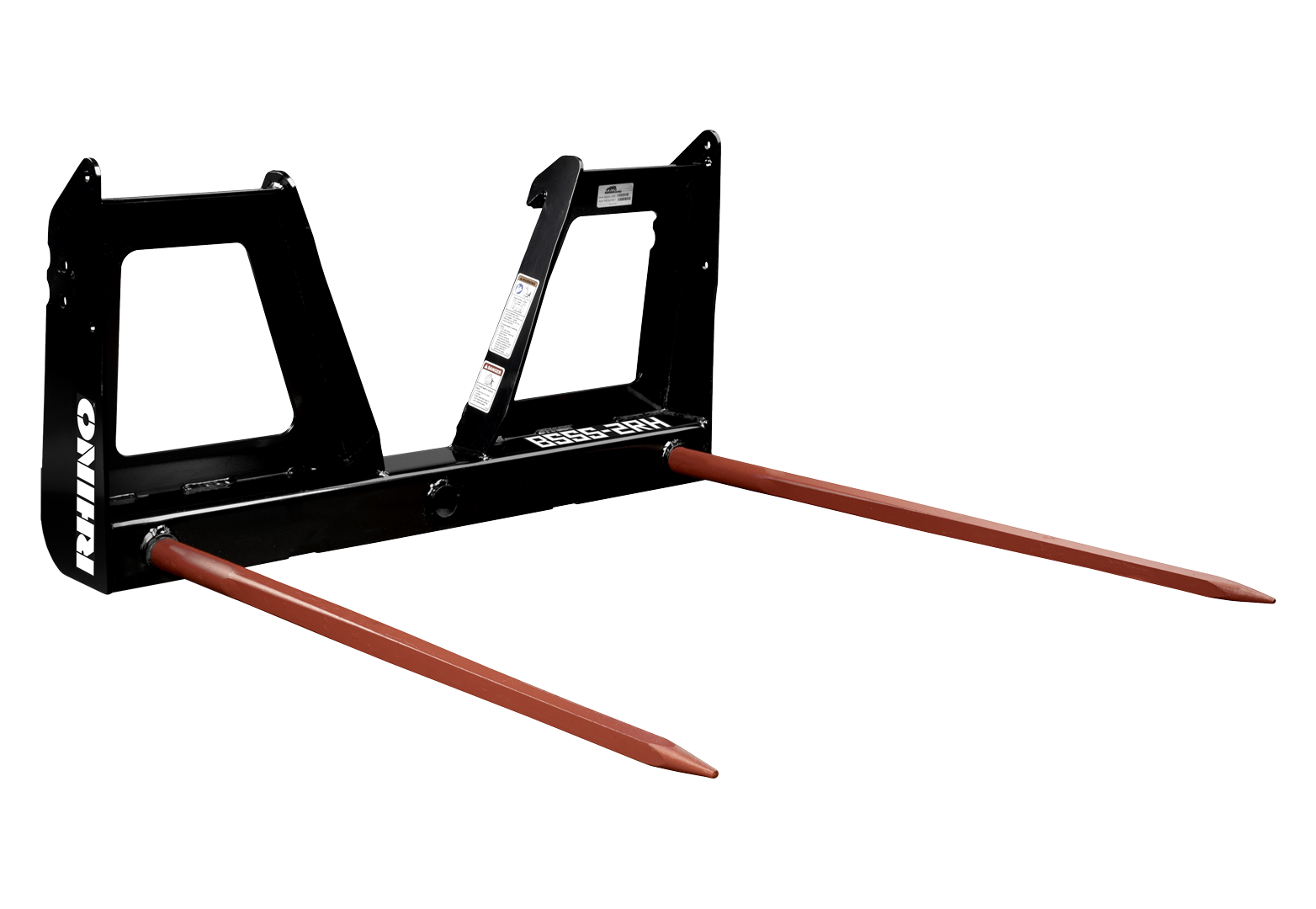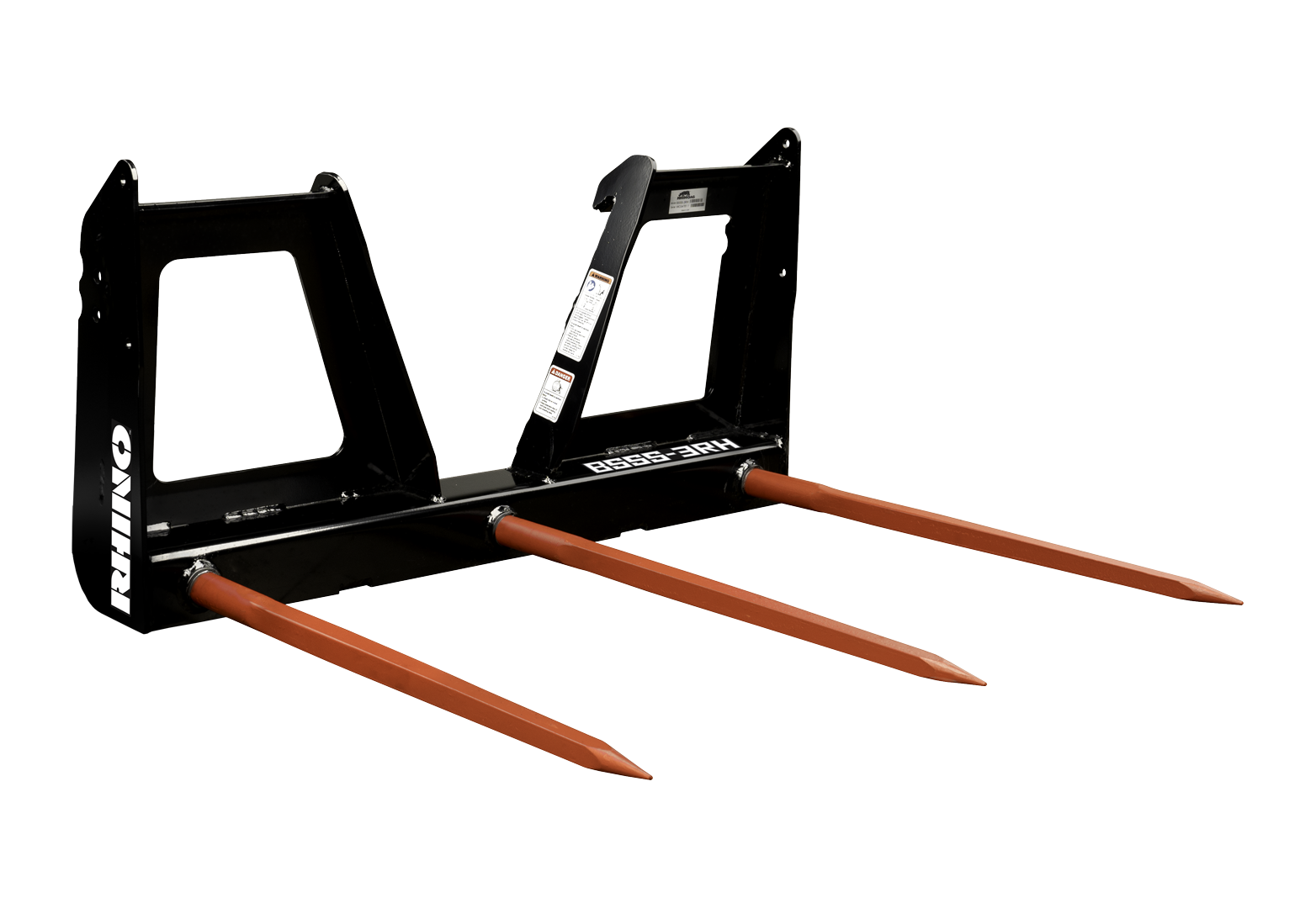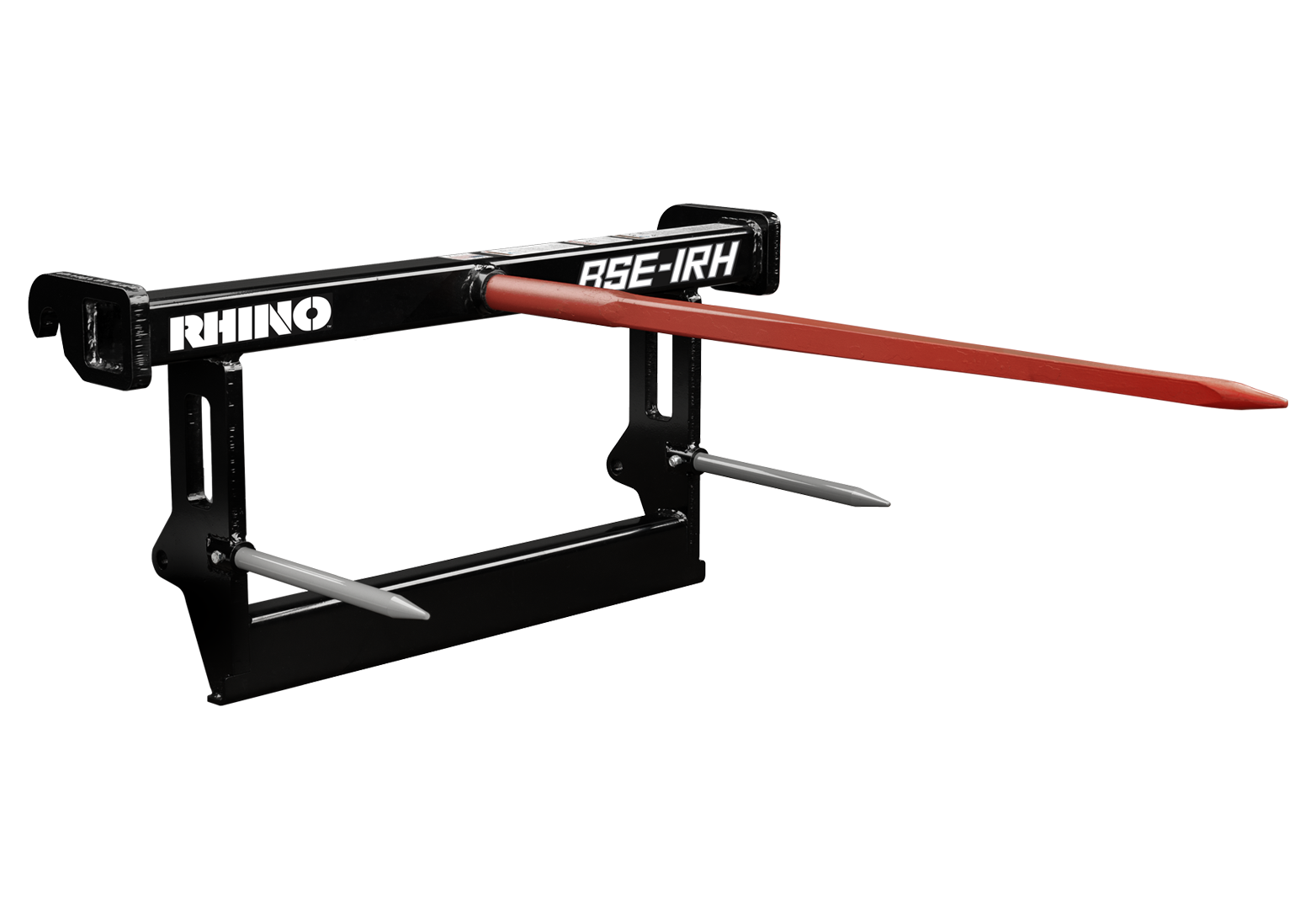 Bale spears help you get your work done fasterRhino bale spears are built Rhino tough. With a lift capacity of Over 4,000 lb. and capable of being mounted on a universal skid steer frame, these bale spears are designed to lift, transport and stack round or square bales of hay or other organic matter.